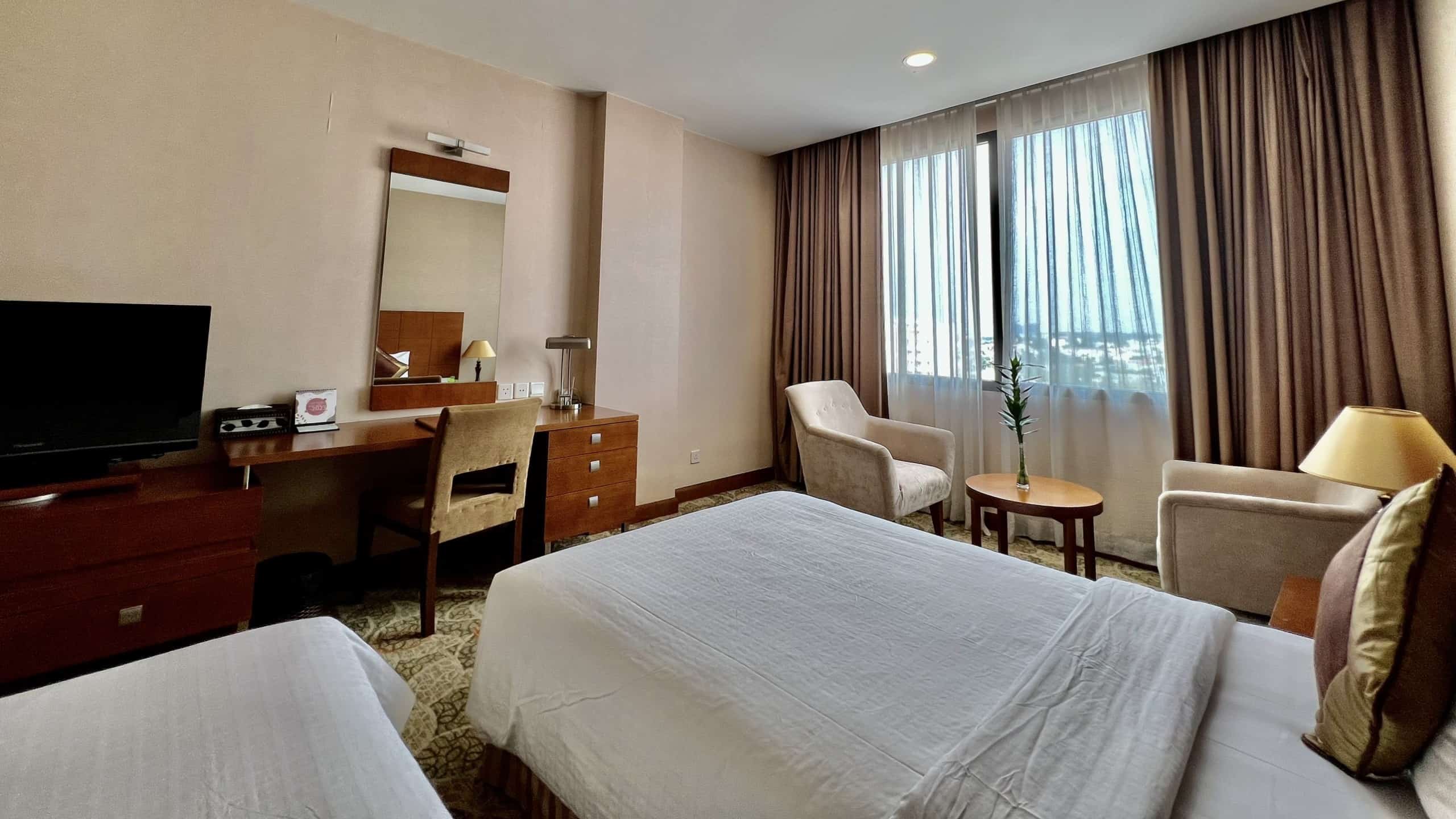 The 42m² Premium Twin Room features modern design with 2 premium single beds and beautiful city views. Room is equipped with full amenities including 50" flat screen TV, minibar, safe and private bathroom with vòi sen massage. Perfect choice for friends, colleagues or families with children.